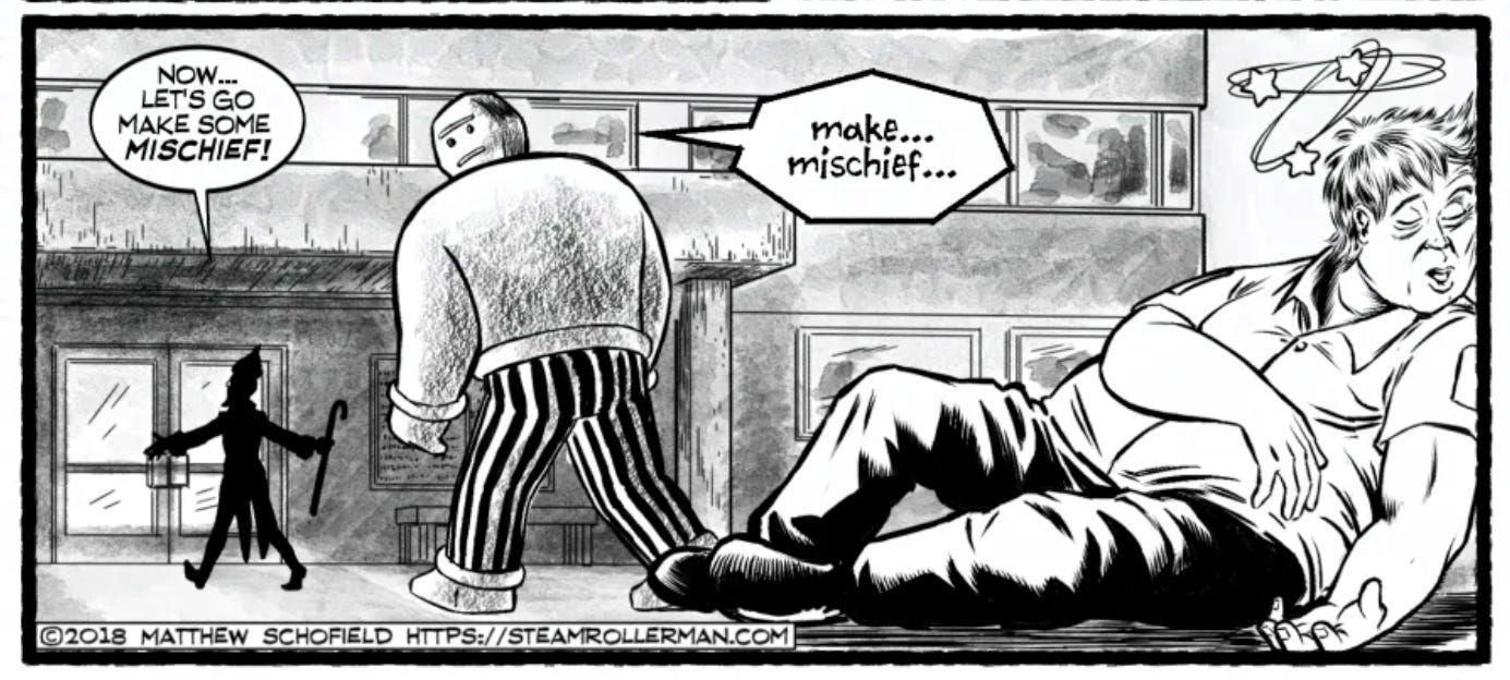 I felt it was important to the story that, despite the comedy, the villain would come across as authentically misanthropic, if not irredeemably evil. The hero, Steamroller Man, comes off as a joke, but I think that’s okay. If the hero is a buffoon, it makes you wonder how they could possibly win. But if the villain of a story also comes across that way, then I think it lowers the stakes of the story and deflates any sense of suspense. A reader won’t believe there’s any danger of the villain winning if he’s played as a joke. Give him a henchman that is constantly a thorn in his side, though, and you can retain his menace while also injecting some comedy into their scenes. Having him frustrated, and acting so horribly towards a simple-minded subordinate, punching down as it were, can serve to strengthen his villainous personality and hopefully make the audience loathe and perhaps fear him even more.