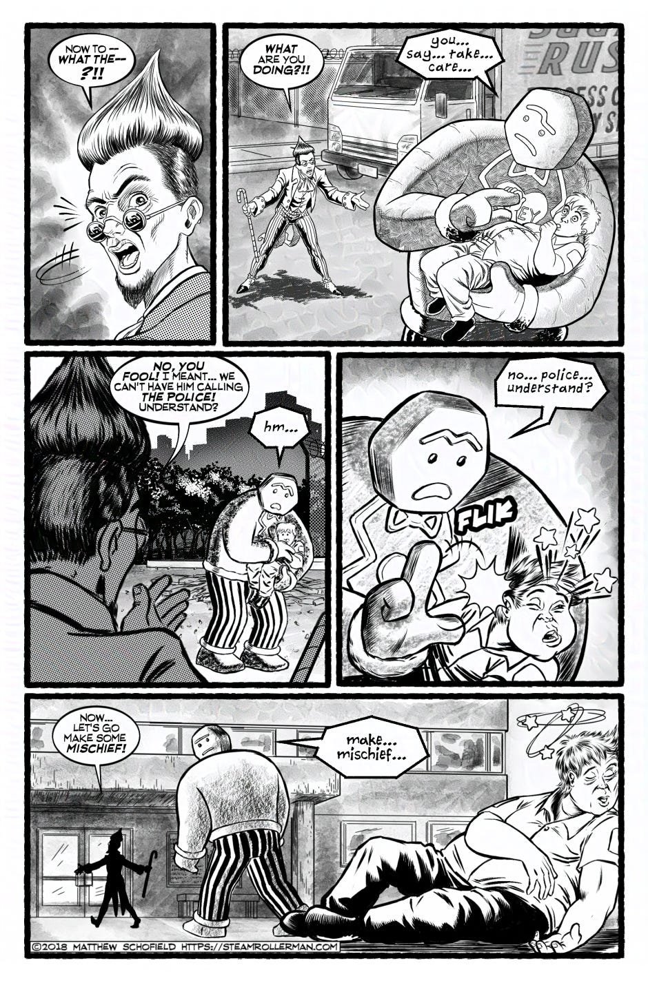 I made this little visual mind-bending gag because at this early stage of making the comic I was being asked questions online that wanted logical, real-world answers as to how a man with a giant Steamroller head could possibly exist and operate in our world. This frustrated me to no end and I often wanted to reply “HE’S… NOT… REAL!!! This is a COMIC!!” Instead, I started to do subtle things like this. Some people get it, some don’t.