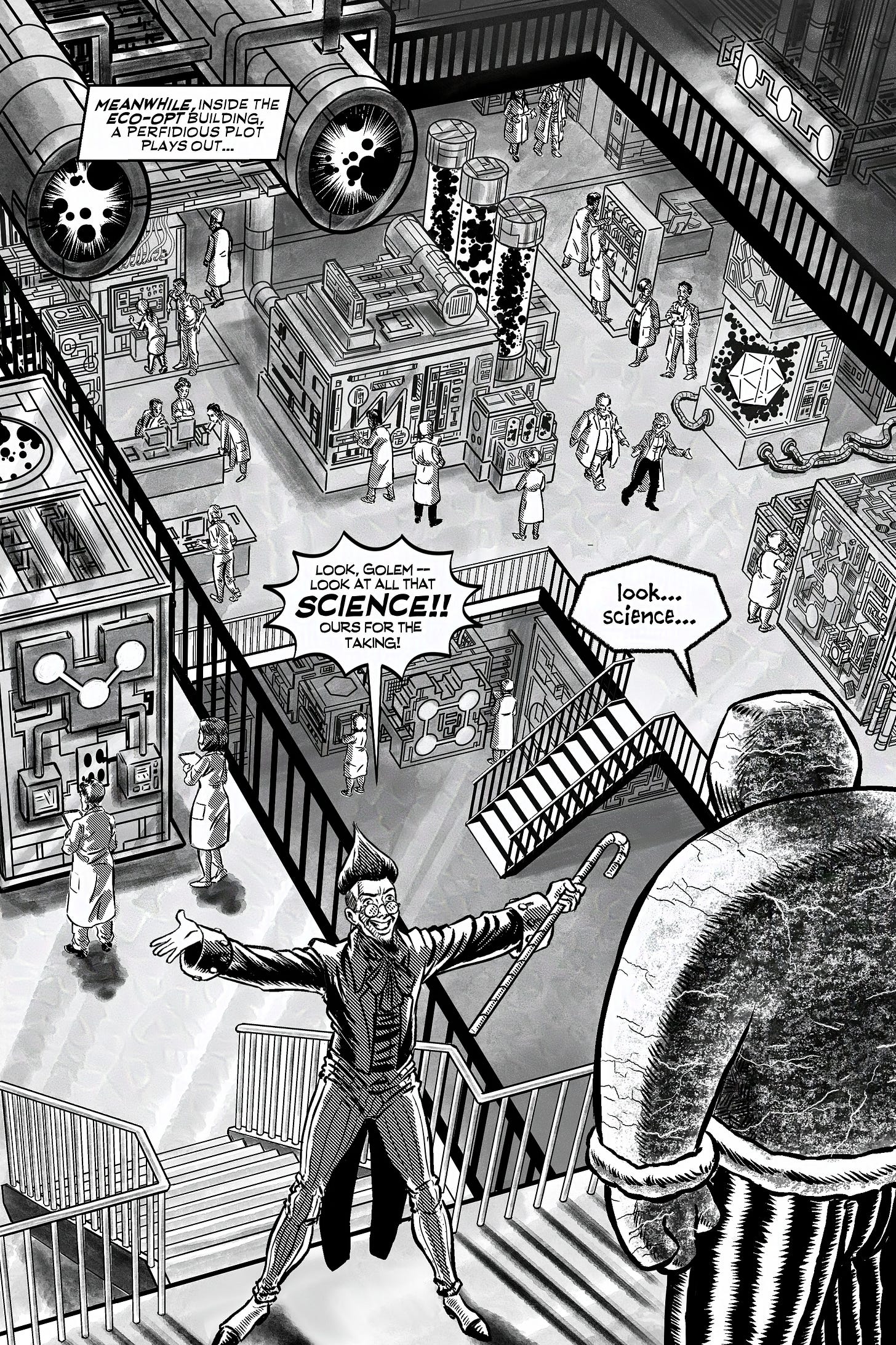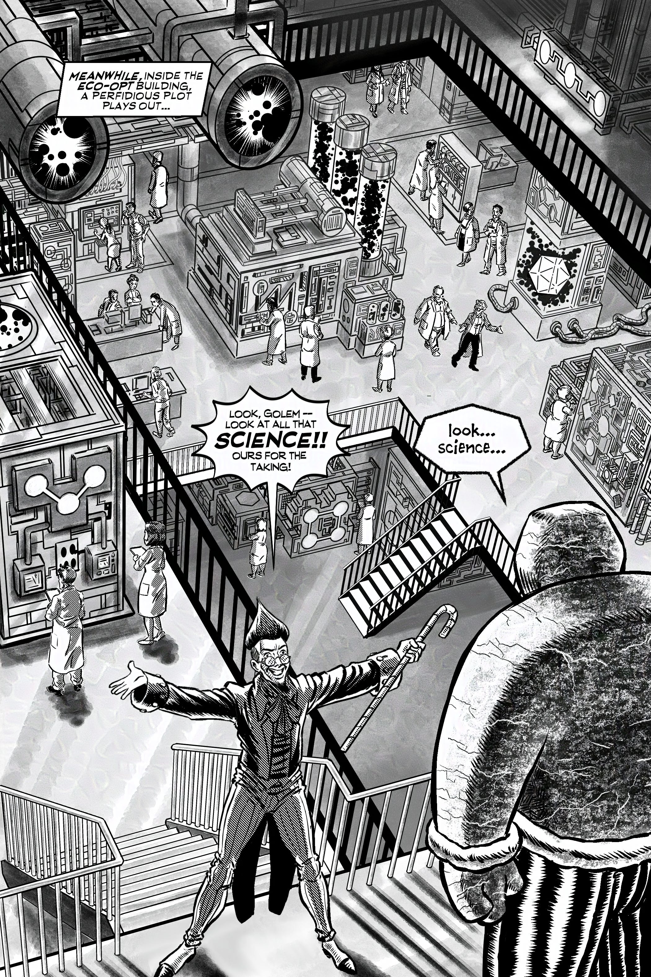 There’s not a real strong gag on this page. I try to have at least one joke on as many pages as I can, but Sugar Daddy is not a real jokey character, so I went for a more subtle, ironic line about wanting to “take” the abstract concept of science.